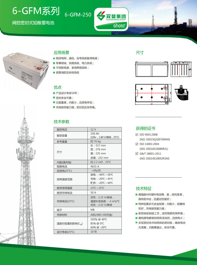 产品描述:“双登”6-GFM系列阀控密封式铅酸蓄电池,适用于通信、铁道、船舶等各种通信、信号系统的备用电源,电力系统、核电站的备用电源,太阳能、风能发电储能系统,以及UPS、应急照明等备用电源。