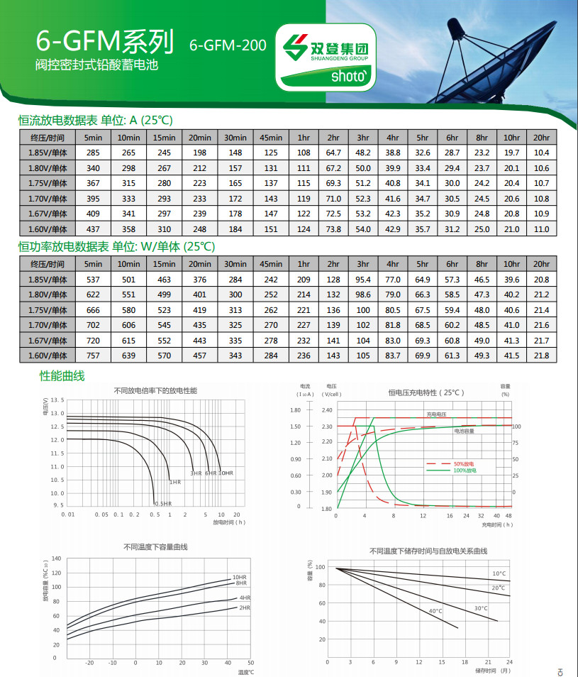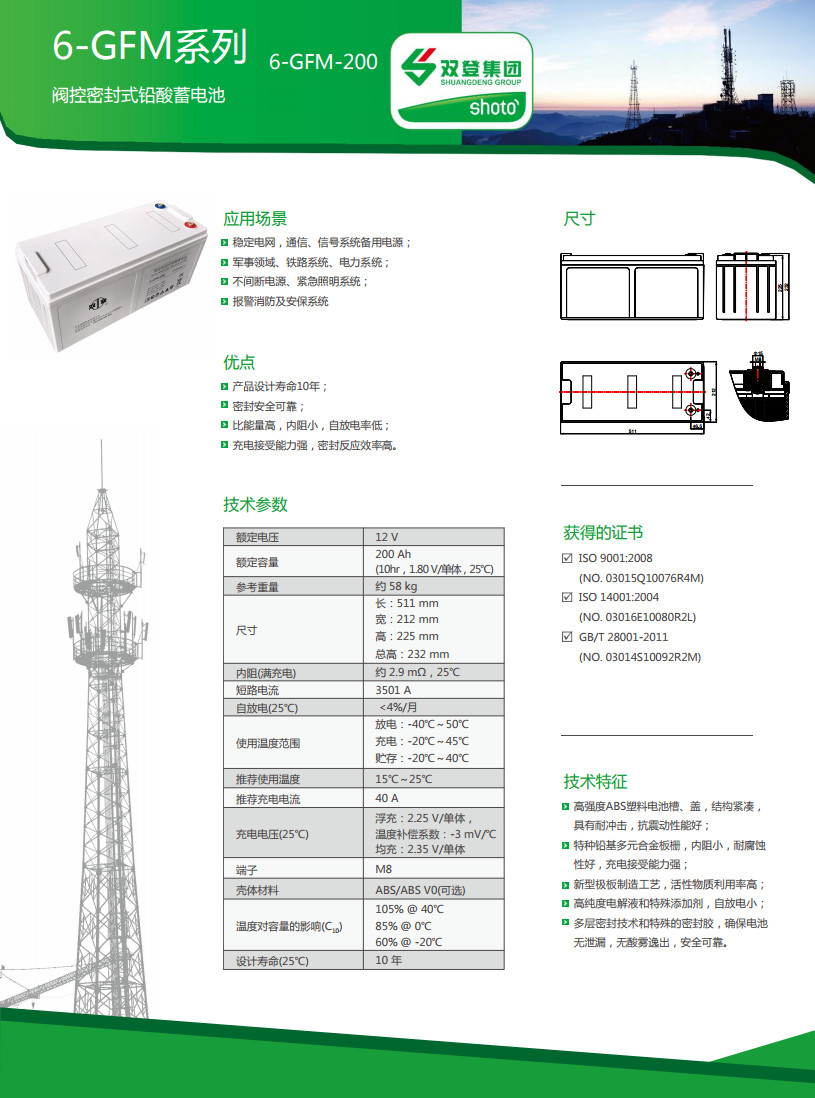 产品描述:“双登”6-GFM系列阀控密封式铅酸蓄电池,适用于通信、铁道、船舶等各种通信、信号系统的备用电源,电力系统、核电站的备用电源,太阳能、风能发电储能系统,以及UPS、应急照明等备用电源。
